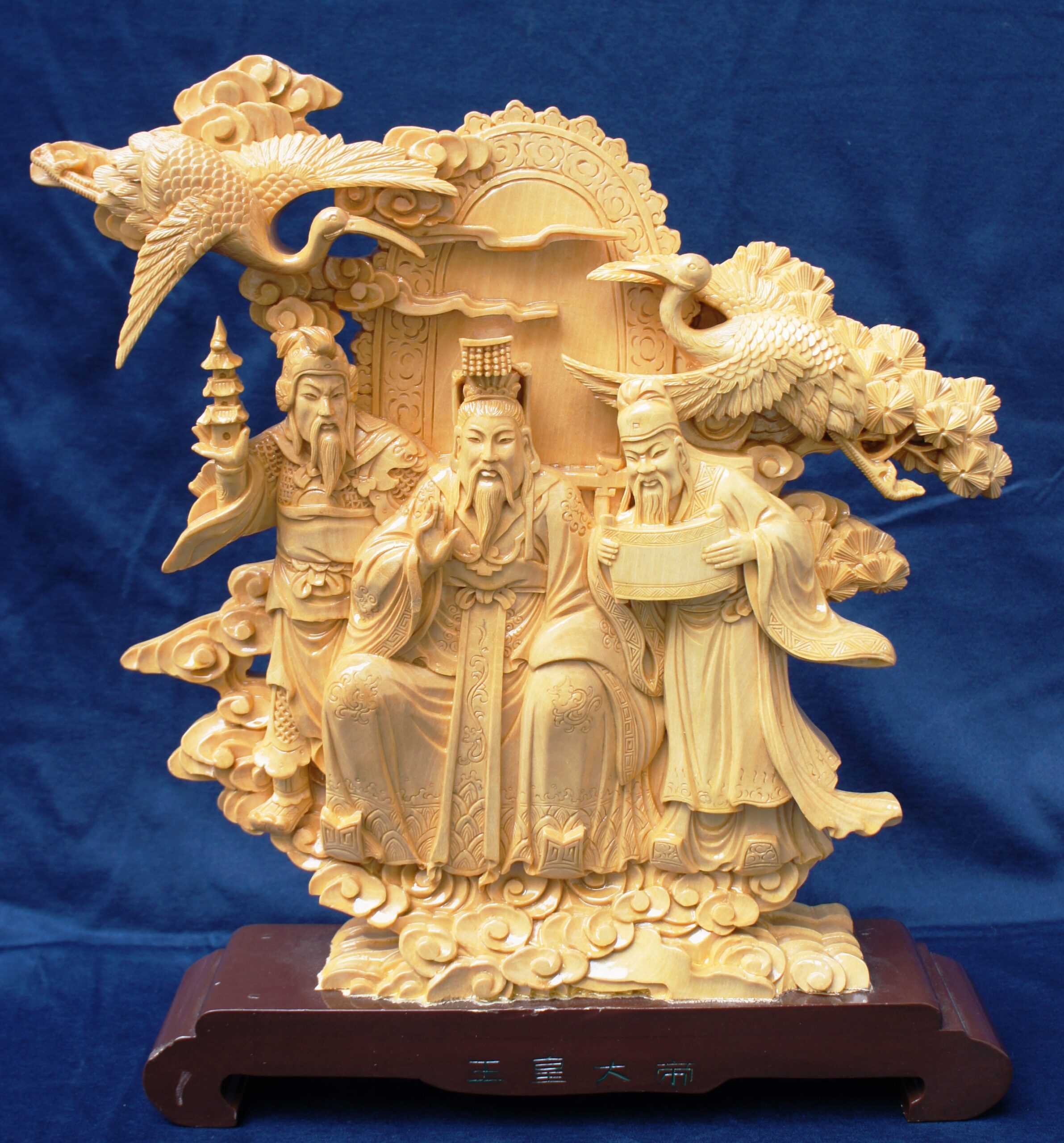 DER JADEKAISER, ist der oberste Gott im daoistischen Götterhimmel, welcher ganz wie das chinesische Kaiserreich nach hierarchischen Prinzipien organisiert ist. So wie der chinesische Kaiser residiert Yu Huang in einem Palast mit Hofstaat, Ministern und Torwächtern. Der Jadekaiser beschäftigte sich nur mit den Angelegenheiten des chinesischen Kaisers, welcher für ihn im Himmelstempel zweimal jährlich Opfer darbrachte. Für die Angelegenheiten der gewöhnlichen Sterblichen sind seine Minister zuständig. Außerdem gibt es noch Würdenträger, welche für die Naturphänomene wie Sonne, Mond, Sterne und Wind zuständig sind. Der Sage nach war der Jadekaiser einst Vorsteher eines Dorfes, wo alles seinen rechten Gang ging. Er trug dort den Namen „der große Wohltäter“. Als im Himmel die Götter untereinander stritten, welcher von ihnen über alle drei Welten, Himmel, Erde und Unterwelt, herrschen sollte, sollen sie ihm die Oberherrschaft angetragen haben. Vorsteher Zhang Bairen („Der, welcher alles toleriert“ – ein hübscher Hinweis auf die dem chinesischen Charakter immanenten hierarchischen und anarchischen Eigenschaften) ließ sich widerwillig dazu überreden, nahm seine Frau und alle Haustiere in den Himmel mit. Da er dort innerhalb kürzester Zeit imstande war, die drei Welten in Ordnung zu halten, wurde er auf Bitte aller der unabsetzbare himmlische Kaiser – so unveränderlich wie Jade.